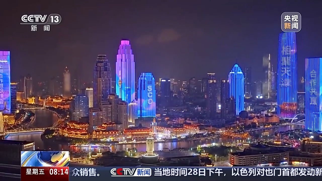 中国与上合国家的城市地标、人文景观在光影中交相辉映,寓意各国携手共织发展梦想,让合作之光在时光长河中永续闪耀,共同奔赴美好未来。天津,这座河海交融、充满活力的城市,正在迎接上合组织天津峰会的开启,相约上合,绽放“津”彩!